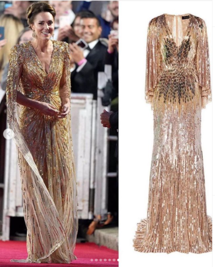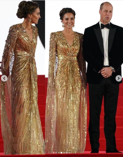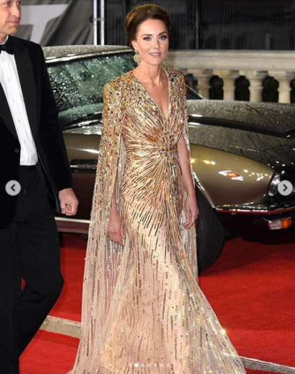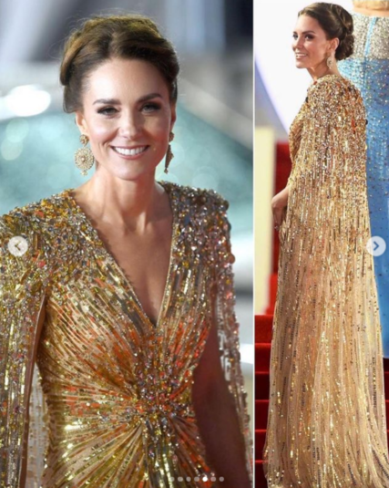 Кейт появилась на премьере в компании принца Уильяма, принца Чарльза и герцогини Корнуольской Камиллы. Миддлтон выбрала для светского раута роскошное золотое платье от Дженни Пэкхем, сшитое на заказ. Наряд стоимостью 2800 фунтов стерлингов отличался приталенным силуэтом, декором на рукавах накидки, структурированными плечами и полупрозрачной юбкой.