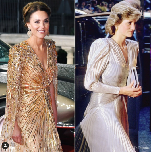Оказалось, что жена принца Уильяма отдала трогательную дань памяти его покойной маме. Платье Кейт в стиле 1970-х годов чрезвычайно напоминало наряд, в котором появилась принцесса Диана на премьере фильма о Джеймсе Бонде «Взгляд на убийство» в 1985 году.