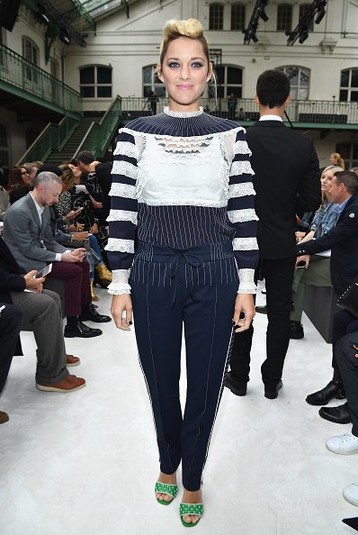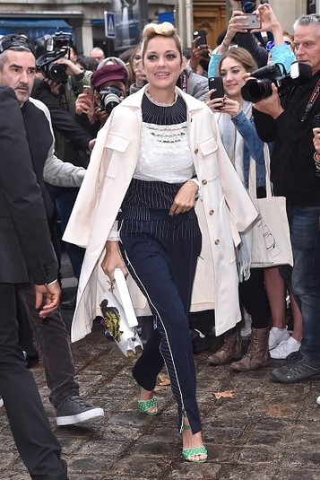На показ Котийяр явилась в синем костюме с белыми вставками. Он состоит из штанов и верха с длинным рукавом. Этот образ актриса подчеркнула зелёными босоножками на высоком каблуке, бежевым пальто и такой же сумкой.