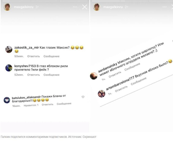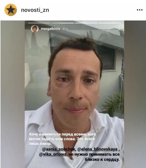 Российские СМИ, как это часто с ними бывает, сочинили очередное разоблачение – на этот раз о Максиме Галкине. В некогда авторитетном издании, а ныне пропагандистской площадке «Московский комсомолец» появилась информация, что на одном из концертов в Израиле юмористу «прилетело от возмущенного шуткой шоумена зрителя яблоком в глаз». И теперь на лице телеведущего красуется огромный синяк. Якобы инцидент случился из-за того, что Галкин высмеял обстановку на РФ: мол, россияне теперь вместо бургеров из «Макдоналдса» будут есть перловку через решетку, а образование в стране испортилось, остались одни инфоцыгане. «Вскоре после концерта Максим в своем Инстаграм в «помятом» виде принес извинения публике за свои слова, в частности Виктории Орловой, Елене Блиновской и Ксении Собчак, объяснив это банально – шуткой», – пишут пропагандисты.