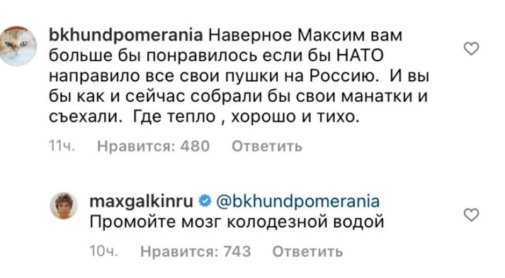 В новом посте в Инстаграм Галкин решил ответить на критику. Одна пользовательница написала, что «Максим наверняка бы обрадовался, когда НАТО напало бы на Россию». На что шоумен ей ответил: «Промойте мозг колодезной водой», – цитирует Галкина НВ.