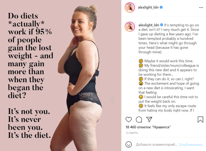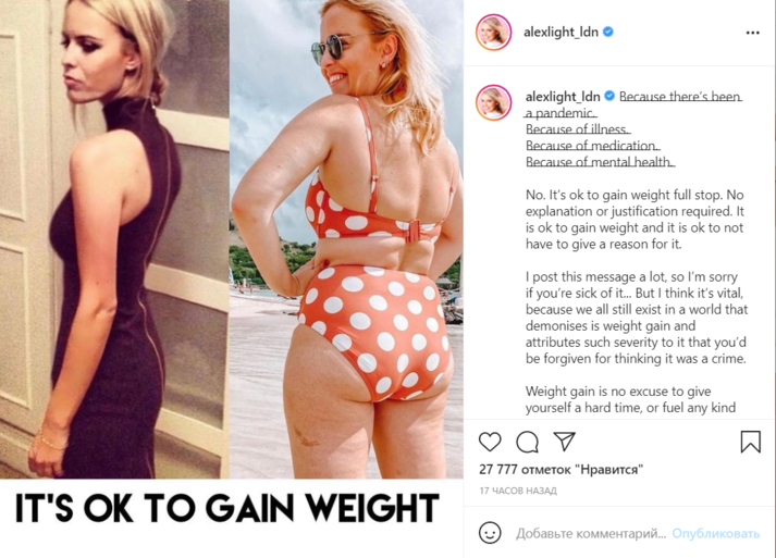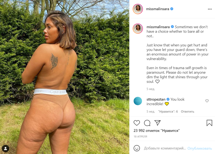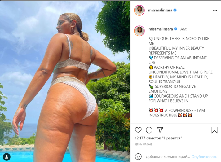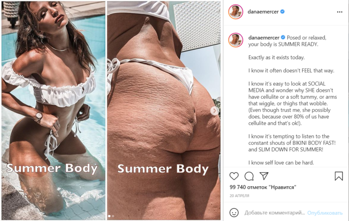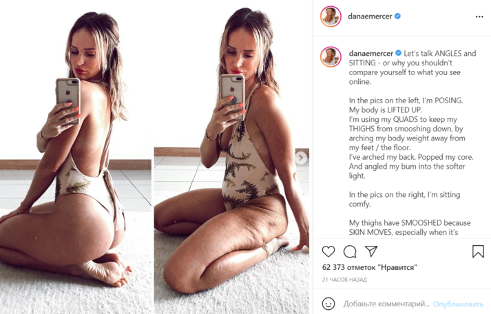 В Инстаграме посты о борьбе с целлюлитом чаще всего публикуют под хештегом #cellulitetreatment. Но есть и другие, например #celluliteisnormal. Именно под ним звезды выкладывают снимки своих неидеальных тел, тем самым призывая женщин по всему миру принимать свою внешность такой, какая она есть.