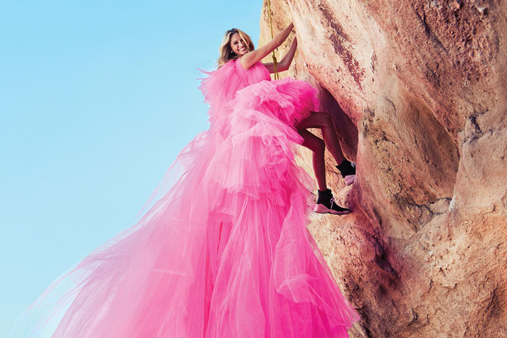 Самая яркая фотография со съемки — Джулия в воздушном розовом платье и кроссовках карабкается на скалу.