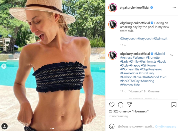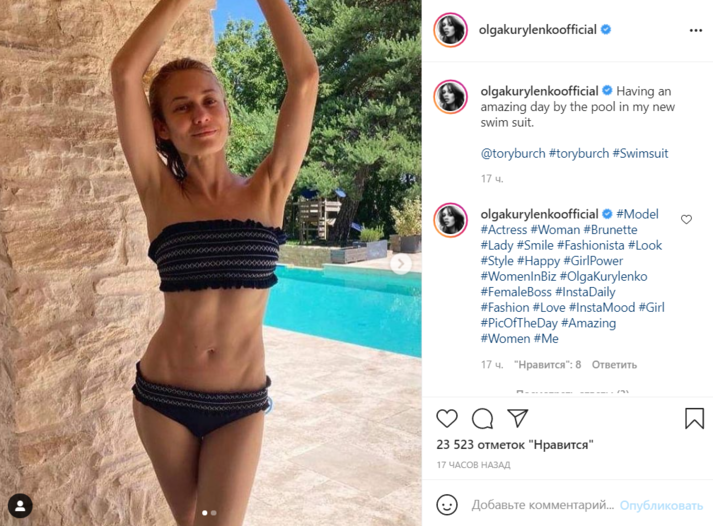 Пляжный наряд знаменитости хорошо подчеркнул ее плоский животик. «Провела удивительный день у бассейна в моем новом купальнике», — подписала снимки Куриленко.