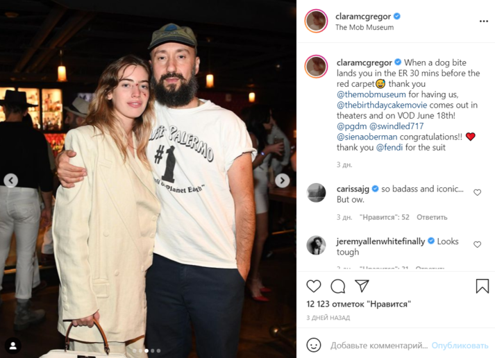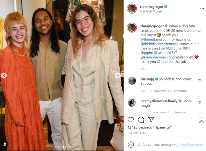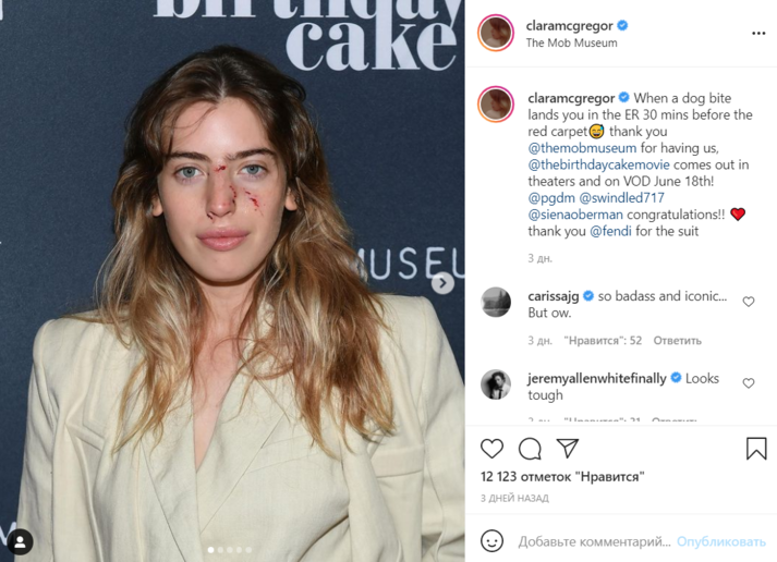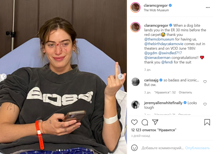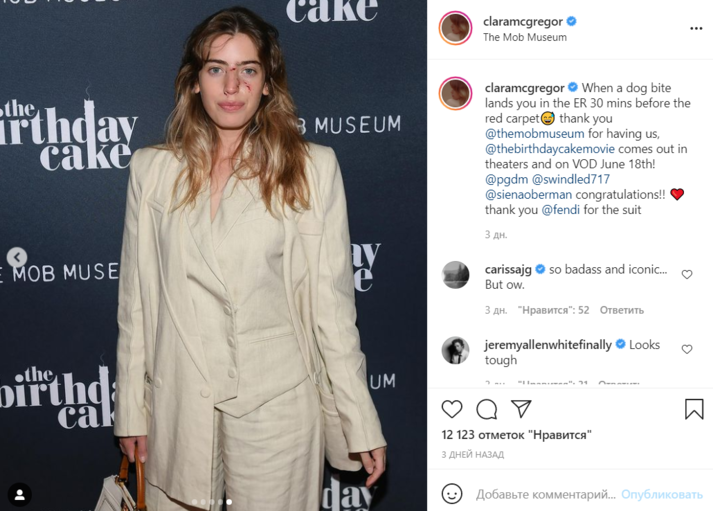 Дочь Эвана Макгрегора появилась на премьере фильма The Birthday Cake сразу после того, как ее выписали из отделения неотложной помощи. Дело в том, что за 30 минут до мероприятия на Клару напала собака и разодрала ей лицо. 25-летняя девушка не запаниковала, а лишь с юмором отнеслась к ситуации, выложив в Instagram фото с больничной койки.