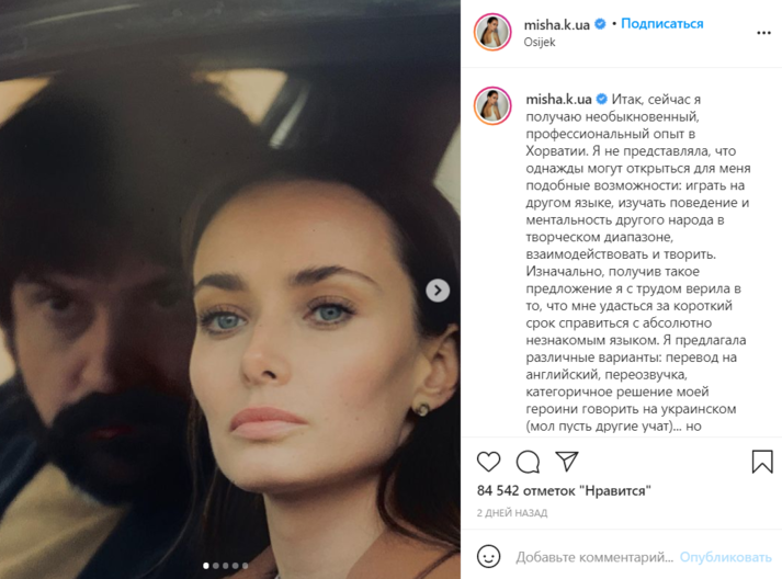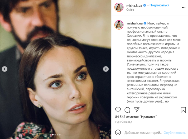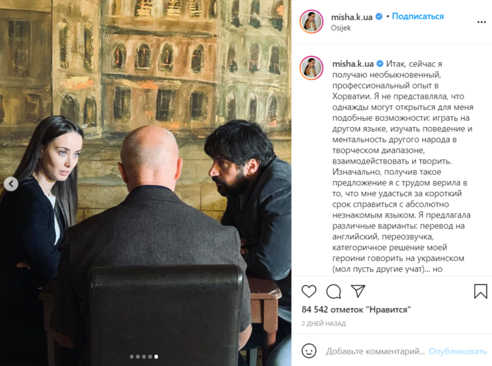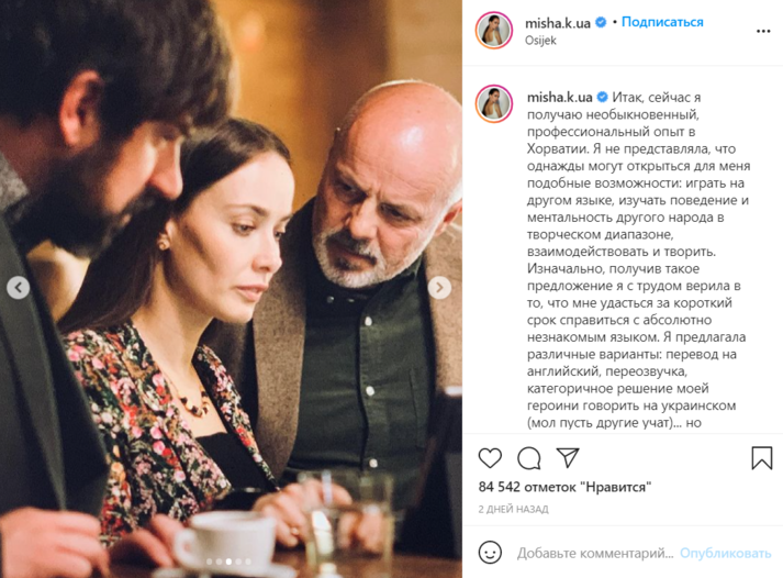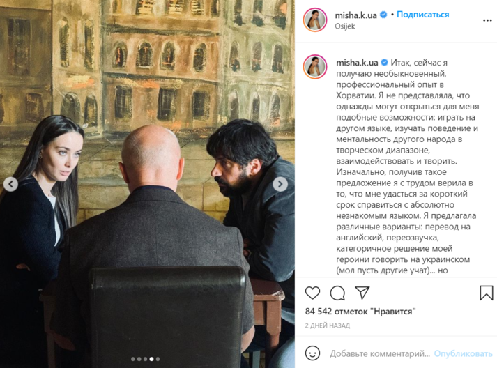 «Сейчас я получаю необыкновенный, профессиональный опыт в Хорватии. Я не представляла, что однажды могут открыться для меня подобные возможности: играть на другом языке, изучать поведение и ментальность другого народа в творческом диапазоне, взаимодействовать и творить», — рассказала актриса.