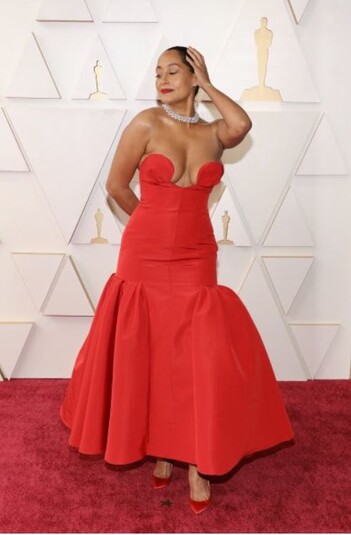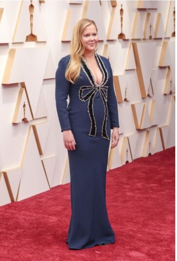 Эми Шумер известна как стендап-комик и актриса. В 2022 году на нее была возложена важная миссия – ее выбрали в качестве ведущей на церемонию, а компанию ей составили Реджина Холл и Ванда Сайкс. Это можно было бы считать триумфом, но вот платье Эми сильно подкачало. Платье ведущей церемонии создали в модном доме Oscar de la Renta, однако слишком глубокий вырез, нелепый, вышитый бант и скучный силуэт сделал выход Эми не слишком впечатляющим.
