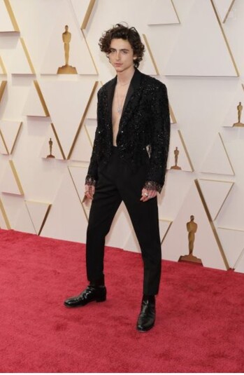 Тимоти Шаламе, ставший звездой фильма «Дюна», кумиром миллионов. поразил зрителей на церемонии открытым торсом. Его наряд от Louis Vuitton сделал его похожим на развратного тореадора. Не лучшее место, чтобы обнажать торс.