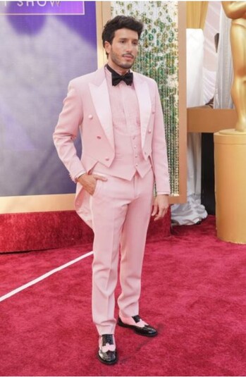 Колумбийский исполнитель Себастьян Ятра исполнял на церемонии песню «Две гусеницы» из мультфильма Encanto. И его сценический наряд, украшенный бабочками в честь Габриэля Гарсии Маркеса, был хорош. Но не его розовый костюм от Moschino, в котором он вышел на красную дорожку Оскара-2022. В нем Себастьян напоминал сбежавшего с выпускного бала школьника середины 1980-х годов.