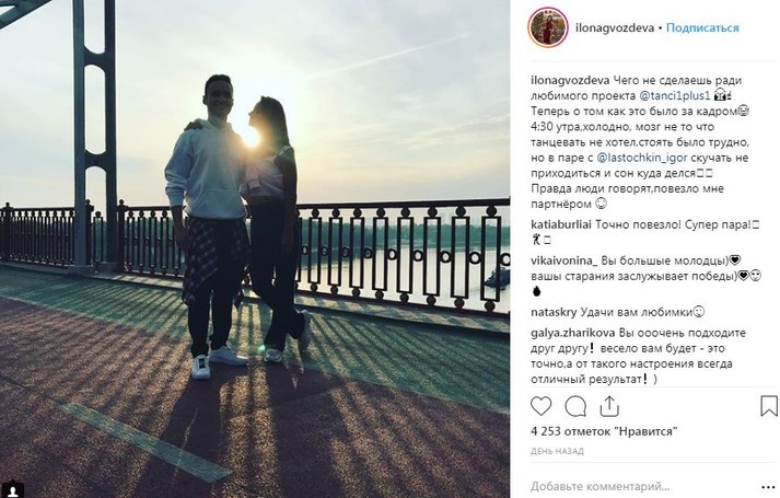 «Чего не сделаешь ради любимого проекта Танцы со звездами. Теперь о том, как это было за кадром. 4:30 утра, холодно, мозг не то, что танцевать не хотел, стоять было трудно, но в паре с Игорем Ласточкиным скучать не приходится, и сон куда-то делся. Правду люди говорят, мне повезло с партнером», - прокомментировала один из снимком Илона.