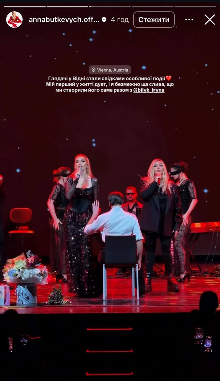 «Відень, дякуємо за цей вечір! Виступати на одній сцені з Іриною Білик це чисте натхнення. Дякую кожному за теплий прийом! Глядачі у Відні стали першими, хто почув наш сюрприз. Мій перший у житті дует, і я щаслива, що ми створили його разом», – написала Буткевич під дописом.