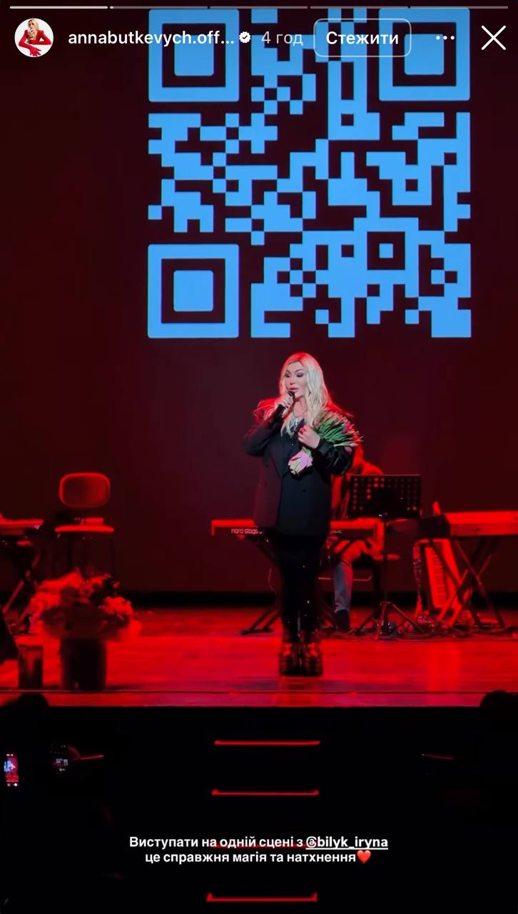 Кадрами з концерту з Іриною Білик Буткевич поділилася у сторіс. Вона вийшла на сцену у довгій чорній сукні, а Ірина Білик була у більш стриманому образі: у чорному піджаку, лосинах та взутті на високій платформі.