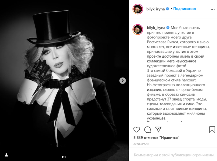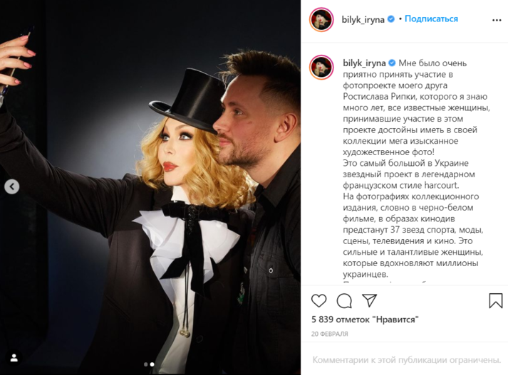 «Мне было очень приятно принять участие в фотопроекте моего друга Ростислава Рипки, которого я знаю много лет, все известные женщины, принимавшие участие в этом проекте, достойны иметь в своей коллекции мегаизысканное художественное фото!», – написала Билык.
