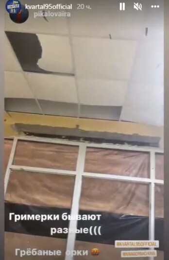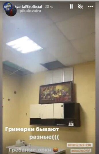 Ирина Пикалова, исполнительный продюсер Квартала 95 и бывшая жена актера Александра Пикалова сняла на видео гримерку коллектива после обстрелов рашистов. Ролик можно посмотреть в сторис Инстаграм студии Квартал 95. Однако, где именно расположено пострадавшее здание – не понятно, геолокация в публикации не выствлена.