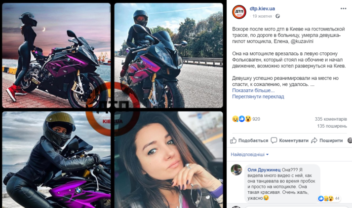 На Гостомельской трассе в Киеве в результате ДТП погибла блогерша-мотоциклистка Елена Кузавини. Об инциденте сообщает dtp.kiev.ua.