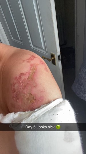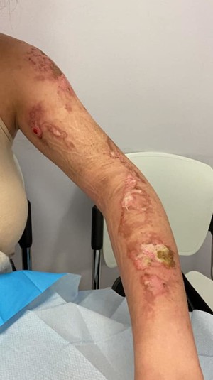 В результате взрыва рука, часть груди и лицо модели покрылись волдырями и покраснениями.