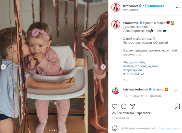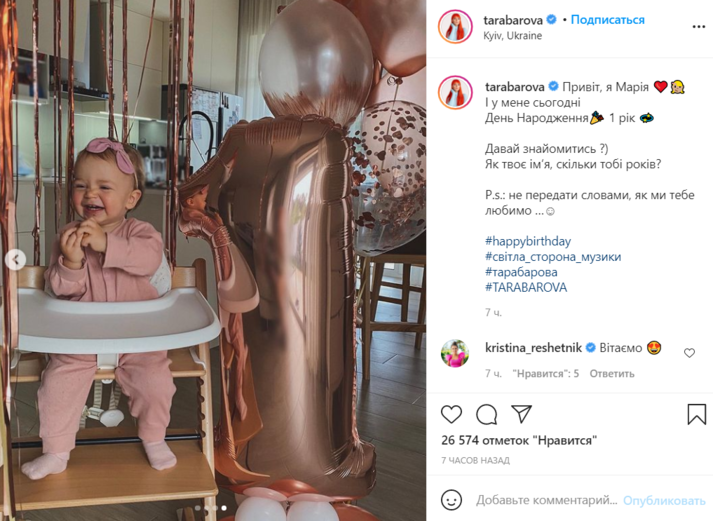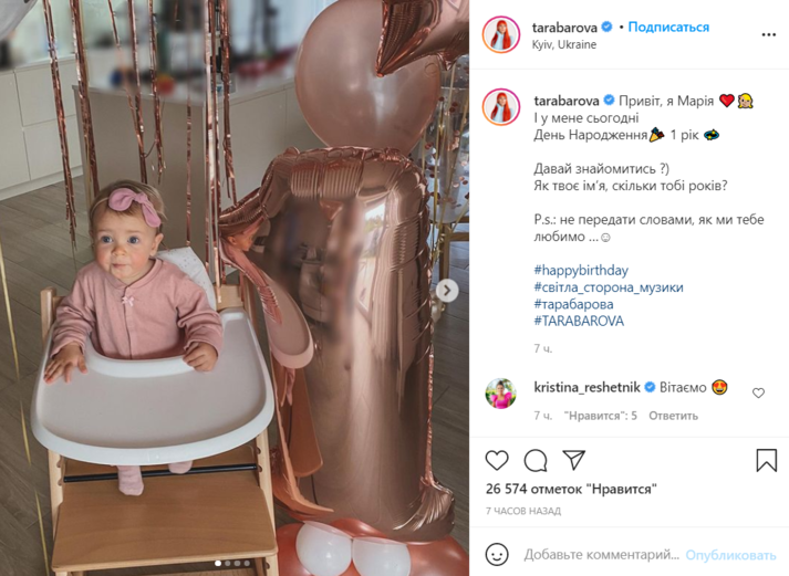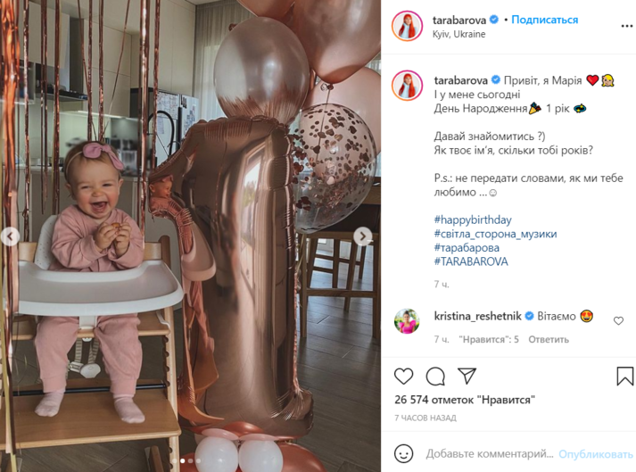 Артистка сделала трогательную публикацию, где поделилась яркими фотографиями малышки. Марию сфотографировала с большими розовыми шариками. Похоже, родители сделали для нее настоящий праздник.