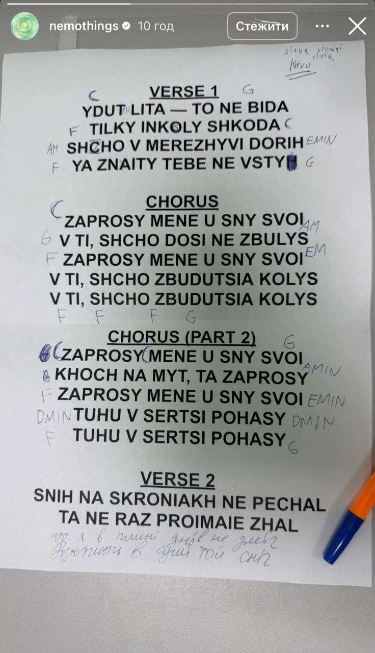 На кадрах, де співаки виконують пісню, можна побачити, як Nemо співають українською мовою. У мережі також з’явилося фото, яке зробили глядачі, на ньому видно, як Nemо готуються до виступу та повторюють слова української пісні «Запроси мене в сни», які написані англійськими літерами.