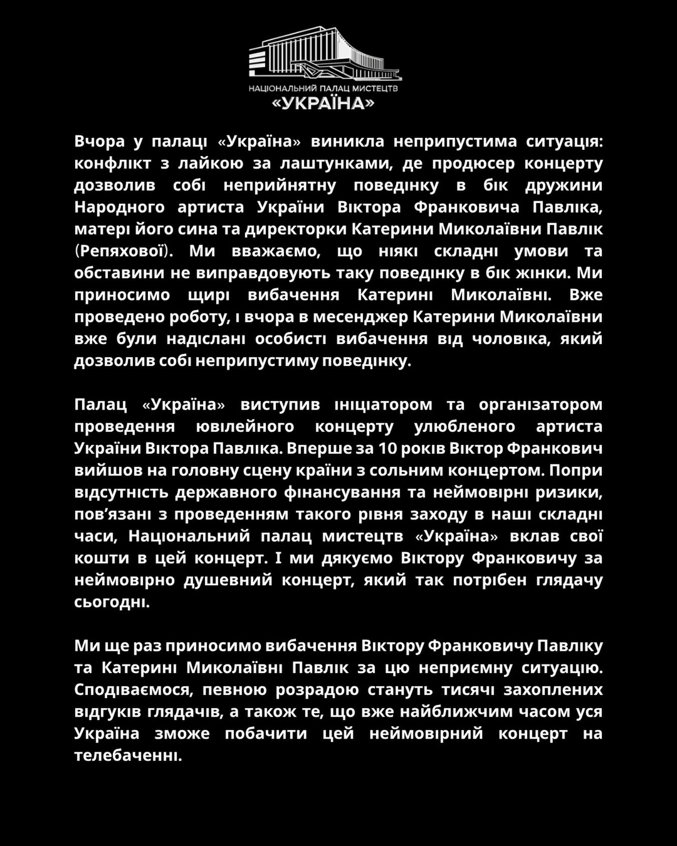 За повідомленням адміністрації, за лаштунками виник конфлікт, під час якого продюсер концерту дозволив собі неприйнятну поведінку та нецензурну лайку в бік дружини артиста, матері його сина Катерини Миколаївни Павлік (Репяхової). У Палаці «Україна» наголосили, що жодні складні умови підготовки заходу не виправдовують таку поведінку в бік жінки.