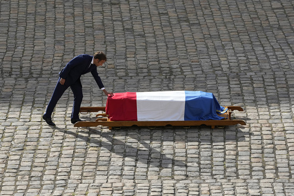 Проститься с Бельмондо вместе с женой Бриджит приехал президент Франции Эмманюэль Макрон, а также премьер-министр Жан Кастекс. Макрон произнес торжественную речь, где назвал актера Бельмондо национальным достоянием. «Мы все узнавали в нем себя», — цитирует Макрона France24