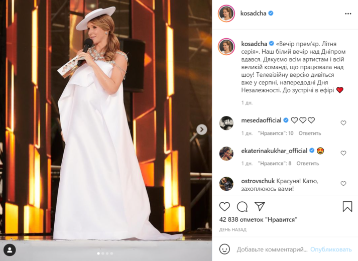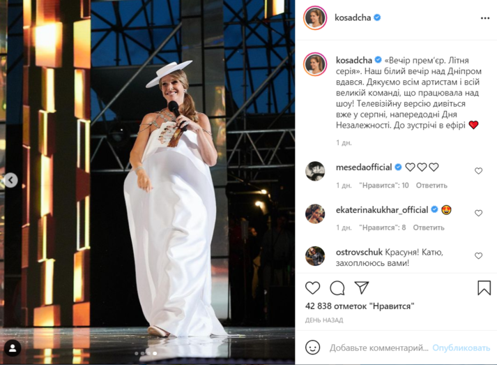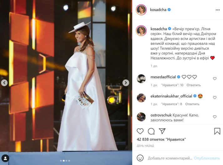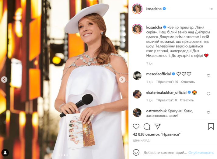 «Вечер премьер. Летняя серия». Наш белый вечер над Днепром удался. Спасибо всем артистам и всей большой команде, работавшей над шоу! Телевизионную версию смотрите уже в августе, накануне Дня Независимости. До встречи в эфире.