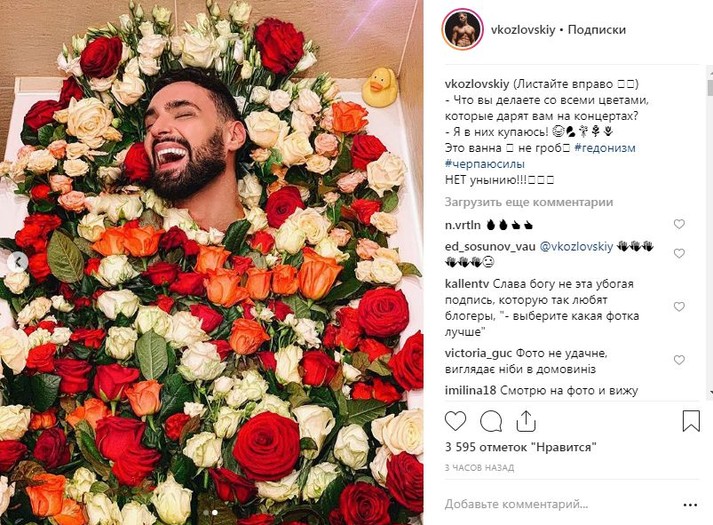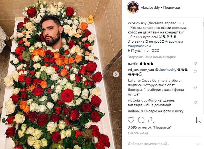 «Что вы делаете со всеми цветами, которые дарят вам на концертах? Я в них купаюсь!», - так подписал фотографию Козловский.