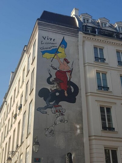 В основе – известная картина Эжена Делакруа «Свобода, ведущая народ», или «Свобода на баррикадах». На мурале Кравцова вместо французского триколора «Свобода» держит флаг Украины. Также в Париже художник Жюльен Маллан создал стенопись под названием «Украина в действии» (L'Ukraine en marche). Изображение появилось на стене частного дома (фото 4) по улице Бюо в XIII округе Парижа. Украину изобразил девушкой в веночке, ступающей по вражеским танкам.