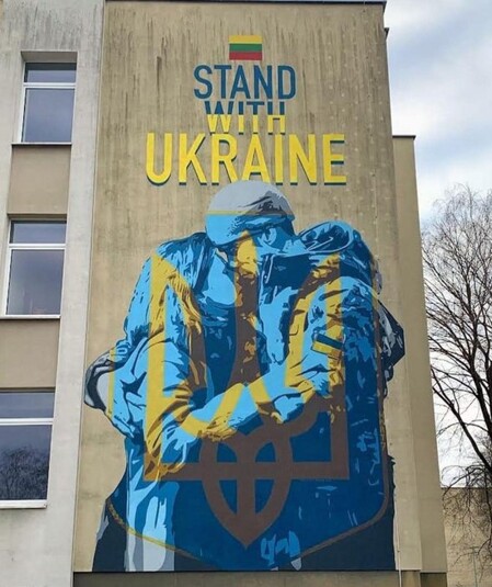 Трогательный мурал украсил стену одного из домов литовского Вильнюса. В поддержку Украины художник изобразил воина ВСУ, нежно целующего девушку. Изображение размыто, сквозь него проступают очертания украинского Тризуба (фото 8).
