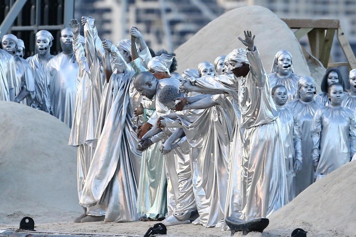 На прошлой неделе американский рэпер Канье Уэст презентовал свою оперу «Мария», в которой он сыграл одну из главных ролей. Для представления Канье пришлось загримироваться с ног до головы. Перед объективами камер эпатажный рэпер предстал весь в серебре: на Уэсте была только серебряная одежда, серебряная обувь и носки, да и сам Канье тоже был серебряным. Стоит отметить, что для оперы все актеры перевоплотились в серебряные одеяния и покрыли свои лица краской того же цвета, но сильнее всех перевоплощением удивил именно Уэст.