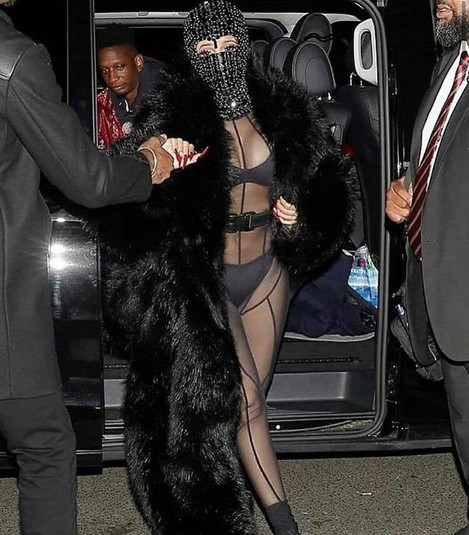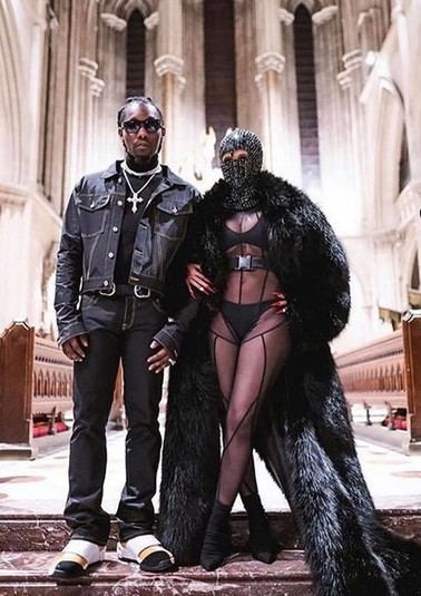 Модній образ американской 27-летней хип-хоп-исполнительницы Карди Би практически не оставил простора для фантазии. Просвечивающая ткань «голого» костюма Карди полностью обнажила ее фигуру. Тело певицы прикрывало лишь черное нижнее белье, подобранное в тон дерзкому образу. Из обуви избранницы рэпера Offset подобрала темные ботильоны на шпильке.