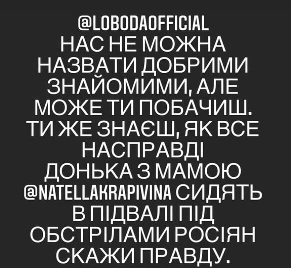 «Светлана Лобода, нас нельзя назвать хорошими знакомыми, но ты может быть увидишь. Ты знаешь, как все на самом деле. Дочь с мамой Натэллы Крапивиной (бывший многолетний директор Лободы) сидят в подвале под обстрелами россиян. Скажи правду. Ведь пользоваться украинским паспортом – это нужно заслужить», – продолжает телеведущая.