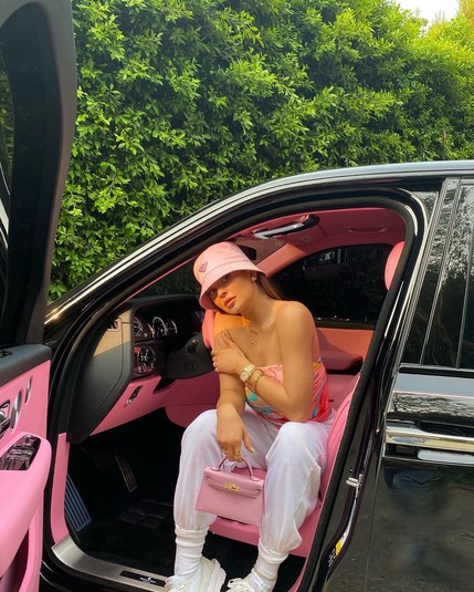 23-летняя инстадива Кайли Дженнер организовала съемку в роскошном автомобиле Rolls-Royce. Салон машины был оформлен в розовых тонах. Кайли предстала в топе с открытыми плечами, белоснежных спортивных брюках и кроссовках. Эффектный образ завершила розовая панамка и аккуратная сумочка в тон.