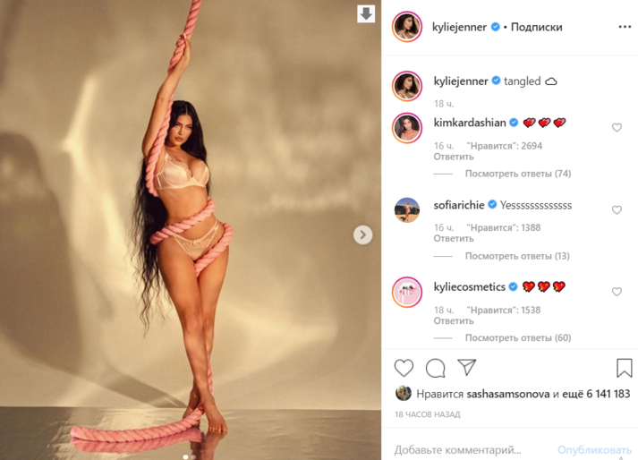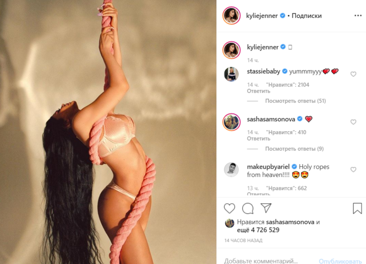 Кайли Дженнер в прозрачном белье обмотала себя розовым канатом (фото)