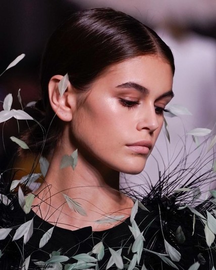 Кайя Гербер вышла на подиум в черном пышном платье в пол, украшенном перьями мятным оттенков — от молочного до темно-бирюзового. Макияж и прическа модели были достаточно сдержанными — Кайе сделали низкий пучок и нанесли едва заметный макияж.