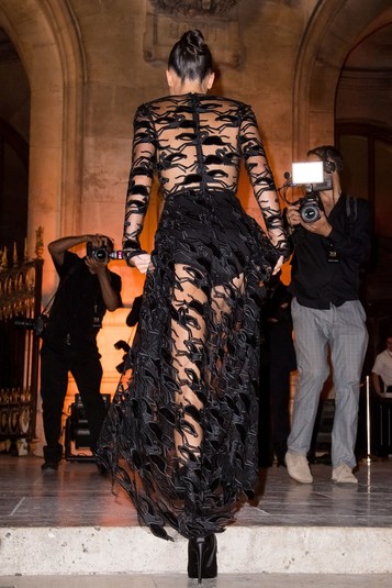 Для вечеринки Longchamp 70th Anniversary в Париже Кендалл выбрала черное полупрозрачное кружевное платье этого французского бренда, обнажив грудь и продемонстрировав всем гостям (а также фотографам, а значит и поклонникам) нижнее белье.