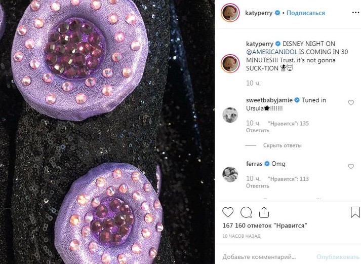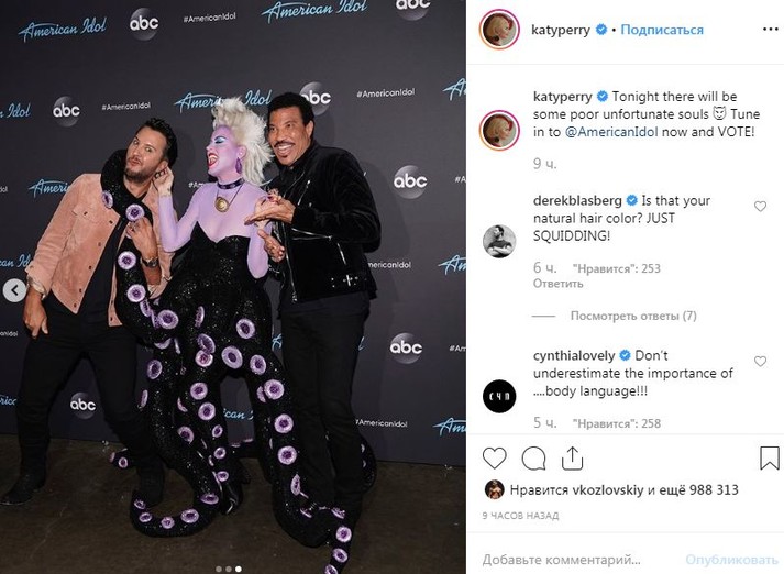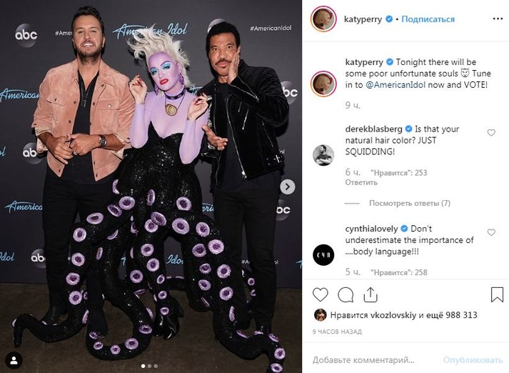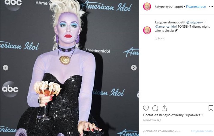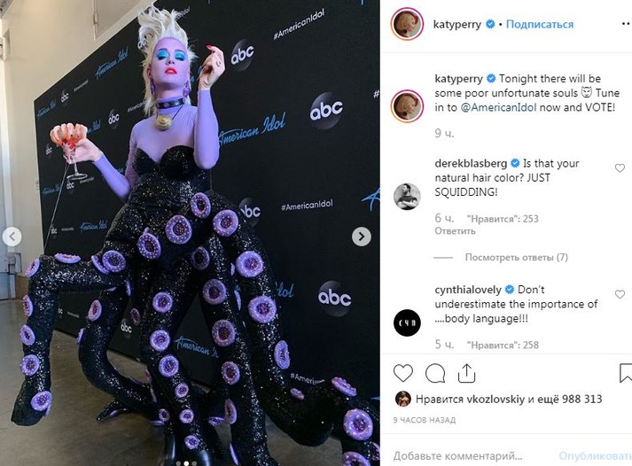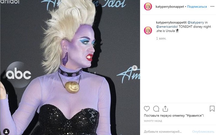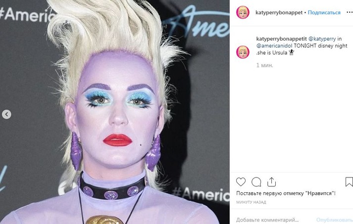 Певица не ждет Хэллоуина, если ей хочется примерить какой-нибудь экстравагантный образ. Так, на съемках нового эпизода шоу American Idol, судьей которого она является, Кэти вышла на публику в облике Урсулы - морской ведьмы из мультфильма Disney.