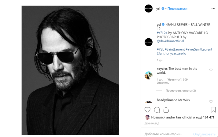 Настоящий ажиотаж наблюдается в Instagram бренда Saint Laurent, который вот-вот представит коллекцию сезона осень-зима 2019/2020. С утра здесь постепенно появляются все новые кадры из рекламной кампании осенне-зимней коллекции, лицом которой стал 54-летний Киану Ривз.