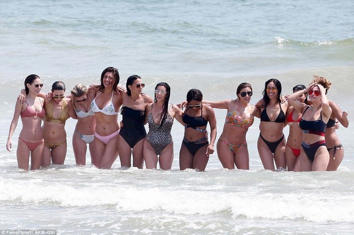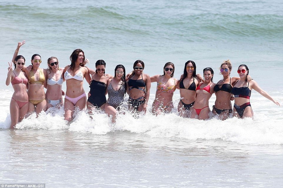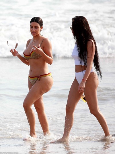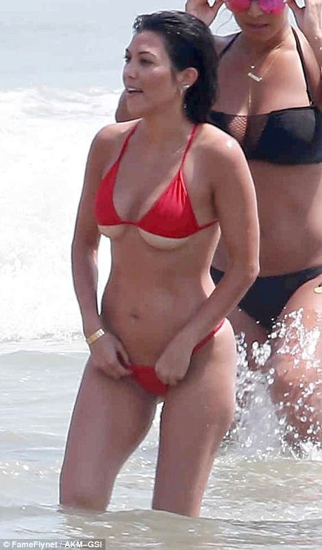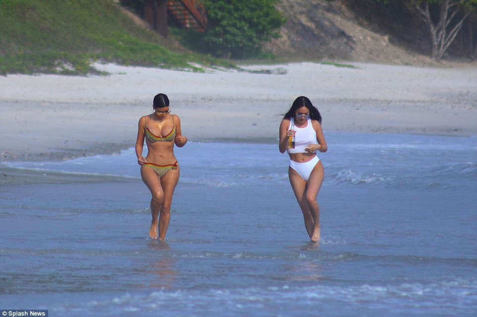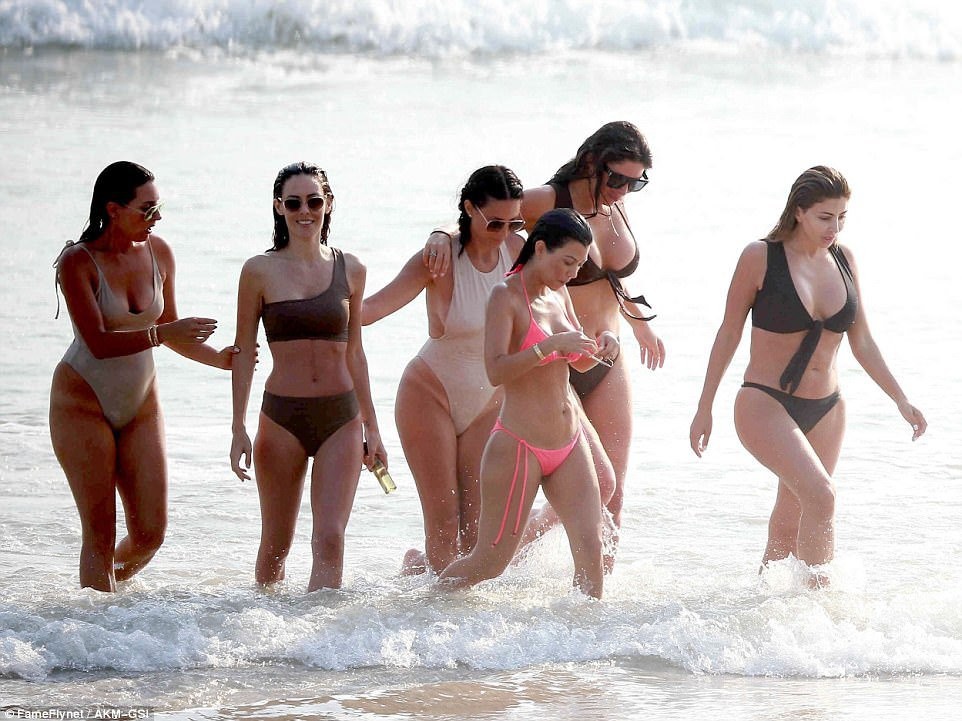Пока Ким с подругой гуляла по берегу, ее сестра Кортни развлекалась с другими девушками в волнах.