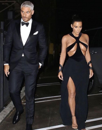 Ким облачилась в откровенное черное платье из коллекции французского дизайнера Тьерри Мюглера 1998 года. Тонкие полоски ткани едва прикрывали бюст звезды.