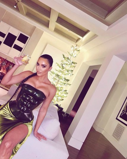 Инстадива Ким Кардашьян поделилась серией фото с празднования Рождества — для семейного ужина Ким выбрала зеленый металлический корсет с имитацией кубиков пресса и салатовую бархатную юбку.