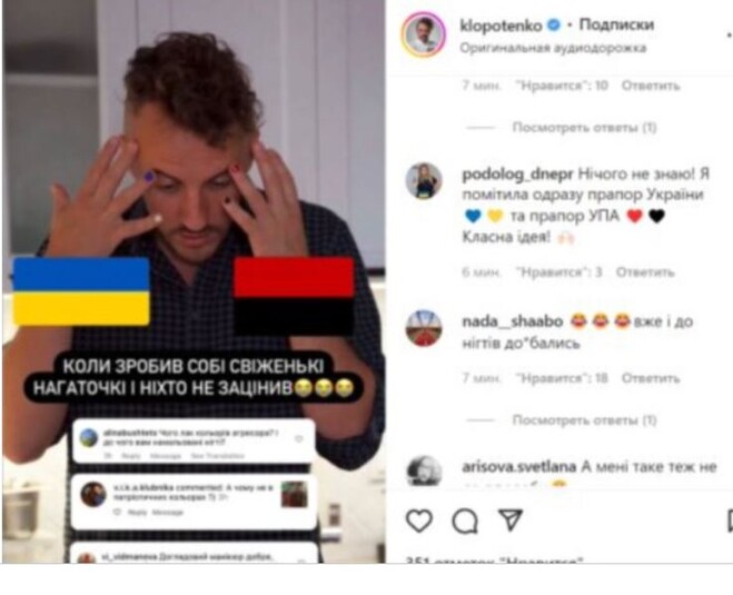 В комментариях поклонники тут же подхватили тему и договорились до того, что ногти у Клопотенко покрашены в цвет российского флага. Пришлось оправдываться: «Желтый – это желтый, не белый».