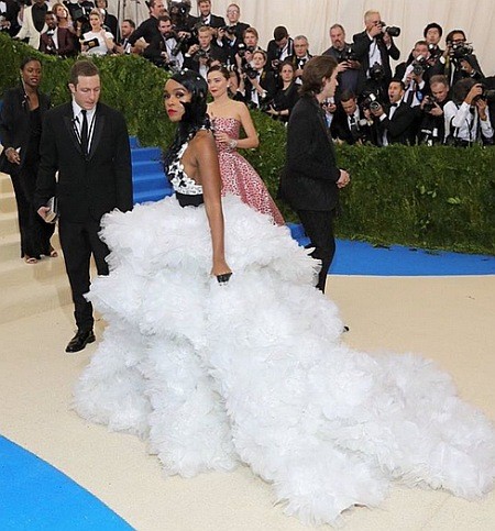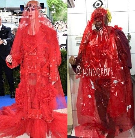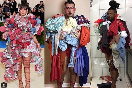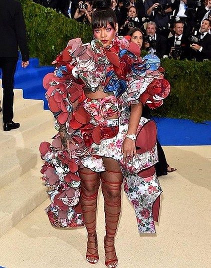 В этом году вечеринка была посвящена творчеству японского дизайнера Рей Кавакубо. Однако надеть платье от ее бренда Comme des Garçons решились далеко не все. Одной из таких смелых модниц оказалась певица Рианна, наряд которой уже стал мемом в сети. В частности ноги Рианны, на которой смелый наряд от Comme des Garçons, сравнили с колбасой.