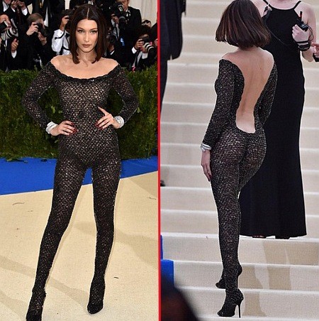 Модель Белла Хадид отличалась на общем фоне откровенным прозрачным комбинезоном с открытой спиной.