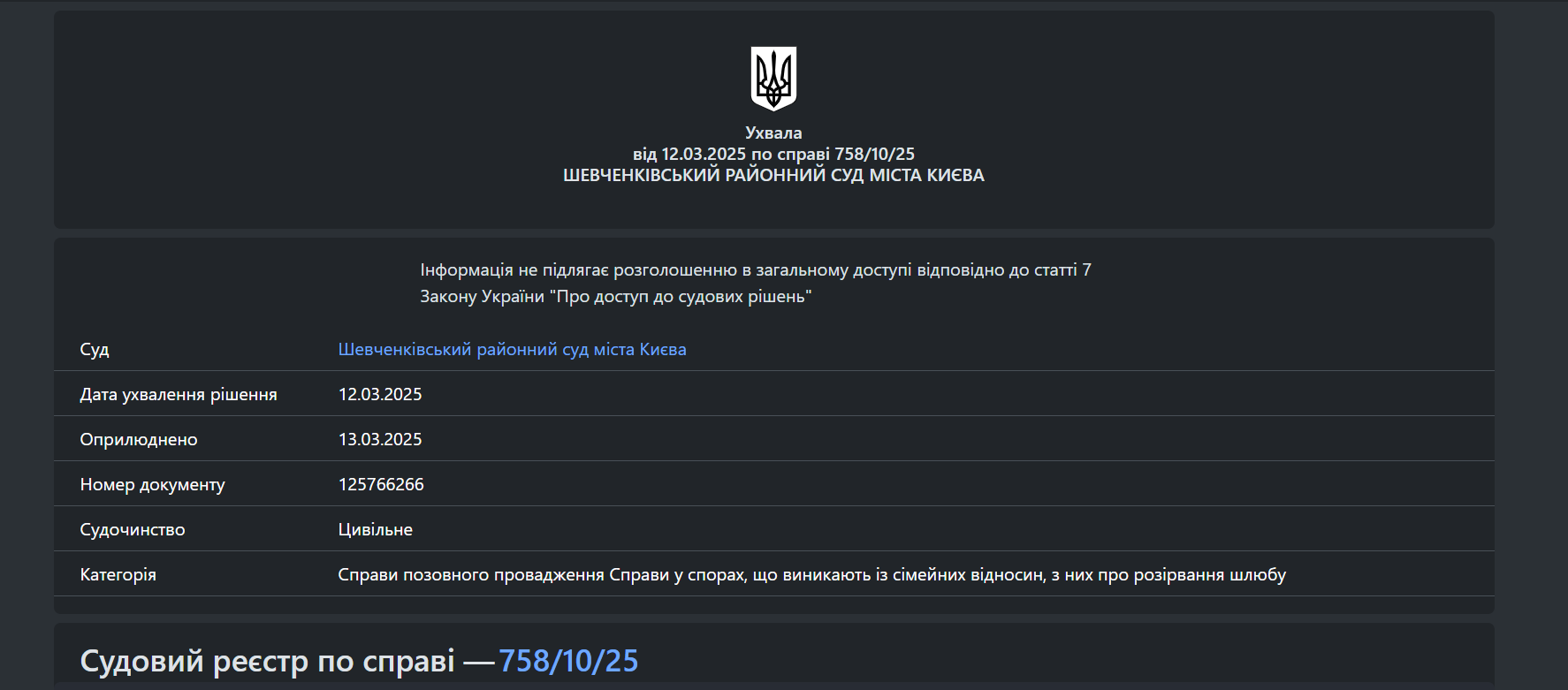 Як повідомляє «Главком», за даними opendatabot, ініціатором розлучення виступив Комаров, подавши позов 1 січня 2025 року до Подільського райсуду. Однак справу було передано Шевченківському райсуду Києва, оскільки місце проживання дружини Комарова у Шевченківському районі столиці.