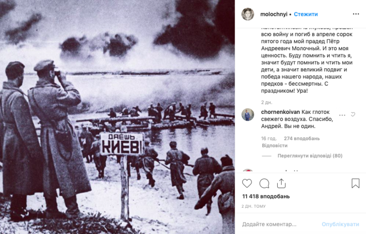 «Здравствуйте соотечественники! 6 ноября 1943 года, войска 1-го Украинского фронта (генерал армии Н.Ф. Ватутин) в ходе Киевской наступательной операции освободили от фашистских оккупантов столицу Украины г. Киев. Почему для меня это событие стало важным, приобрело очень ценное значение? Ведь ещё пять лет назад, я не писал об этом, не выкладывал такие посты. Ведь ещё пять лет назад я даже и подумать не мог, что по Киеву толпами будут ходить фашисты. Я даже представить себе не мог, что будут оскверняться памятники героям Великой Отечественной Войны. Что будут сносить памятники Жукову и Ватутину», - написал он.
