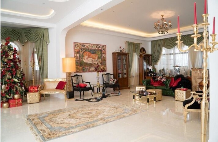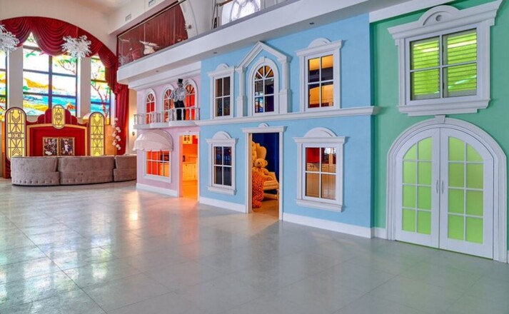 Вход – резные ворота из богатого темного дерева. Прямо внутри дома постелена красная ковровая дорожка. Стены обильно увешаны картинами (портретами Филиппа в том числе). Мебель обнесена позолотой. Круговая лестница, как и двери, выполнена из цельного дорогого дерева. Детская игровая похожа на интерьеры небольшого музея или «Детского мира» – этакий мини-дворец для детей. Рядом с ней расположен довольно крупный бассейн.