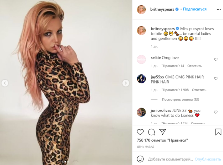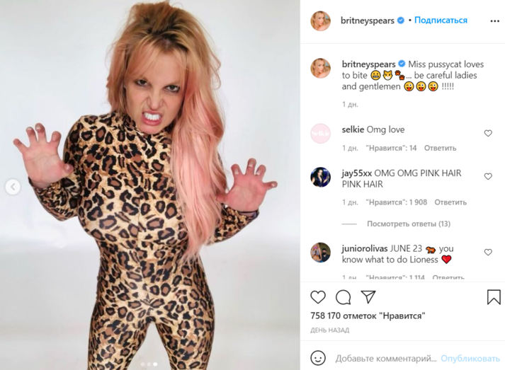 39-летняя певица Бритни Спирс поэкспериментировала с имиджем. Спирс слегка изменила оттенок волос, добавив розовые пряди. Бритни дополнила новую прическу темными smoky eyes. В последнее время артистка заметно похудела и часто подчеркивает фигуру обтягивающими нарядами. В этот раз звезда облачилась в комбинезон с леопардовым принтом.