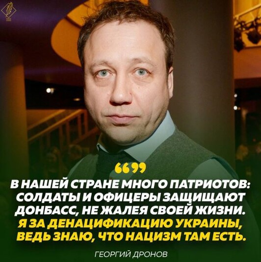 В соцсетях появился отрывок из интервью Георгия Дронова, одного из главных актеров сериала «Воронины» для ютуб-канала BalasanyanChannel. На видео исполнитель роли Константина Воронина публично поддерживает войну в Украине: «Я думаю, что в [россиянах] огромное количество патриотизма. Сейчас солдаты, офицеры, которые принимают участие в спецоперации … Я понимаю, что у нас общество разделилось, но я считаю, что это – патриоты, которые совершают подвиг», «В нашей стране много патриотов: солдаты и офицеры защищают Донбасс, не жалея своей жизни. Я за денацификацию Украины, ведь знаю, что нацизм там есть».