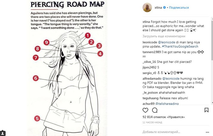 Певица также поделилась фотографией, которая демонстрирует, в каких местах у нее есть проколы. По словам звезды, она никогда не станет прокалывать пупок (эта идея ей кажется слишком избитой), а также язык.