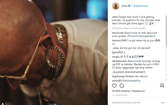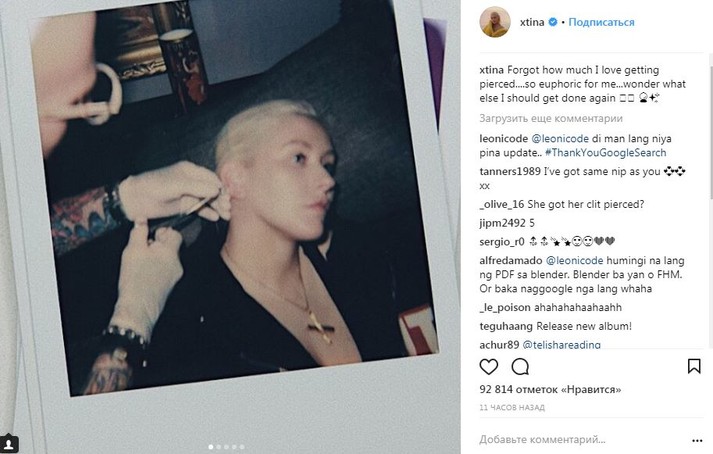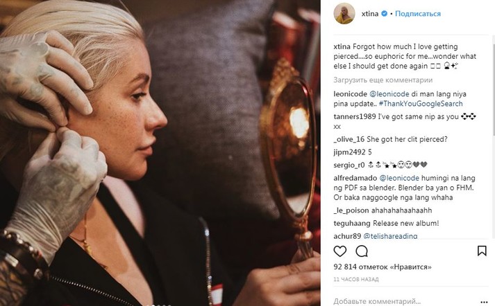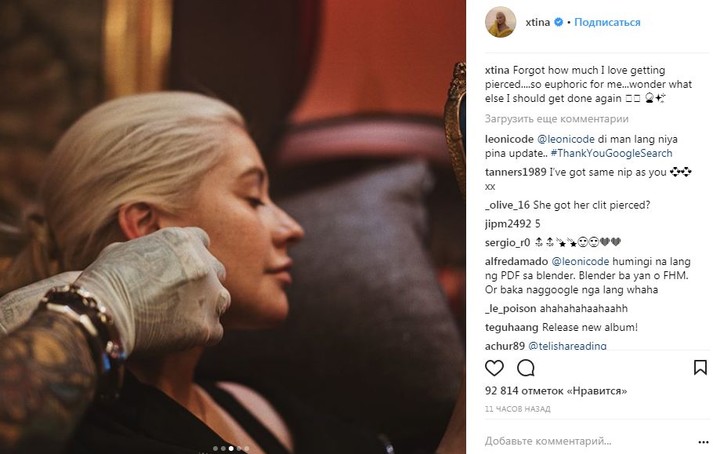 Кристина Агилера то и дело удивляет своих поклонников. То она призналась, что встречалась с геем, то устраивает откровенные фотосессии прямо в своей ванне, а то и вовсе делает снимки без макияжа. На этот раз она продолжила экспериментировать с внешним видом и сделала себе очередной пирсинг. Об этом артистка рассказала на своей странице в Instagram и поделилась фотографиями.